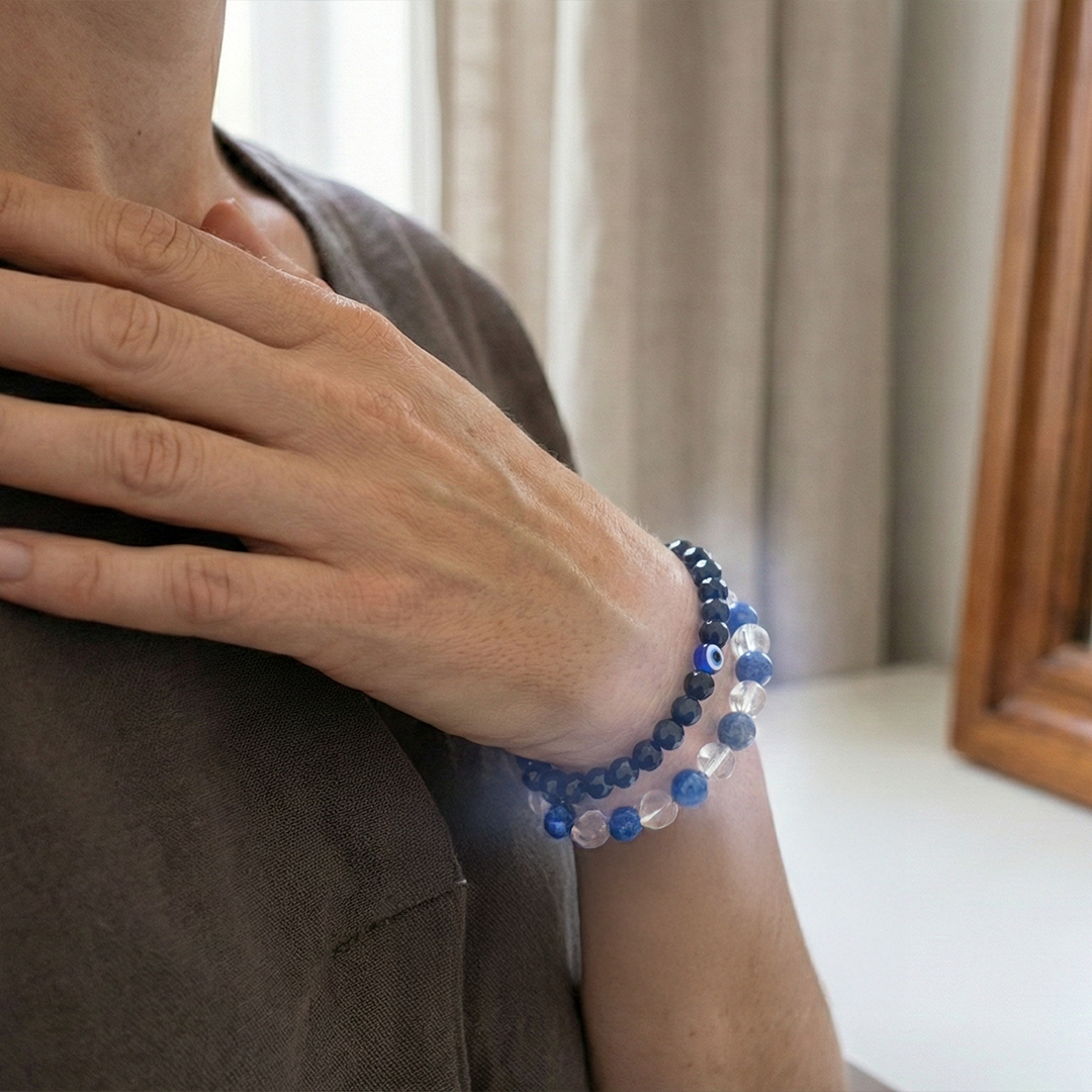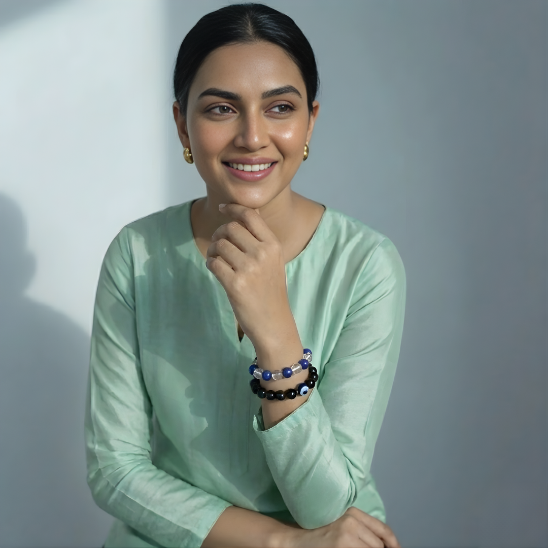 The Connected Hearts Kit focuses on communication, clarity, and energetic protection in relationships. It includes a Clear Quartz + Lapis Lazuli bracelet to encourage honest expression and emotional clarity, and a Black Tourmaline bracelet with Evil Eye to shield the relationship from negativity, misunderstandings, and external influences.