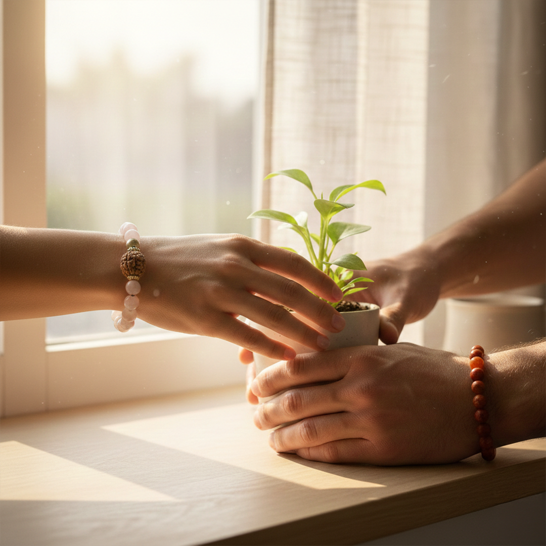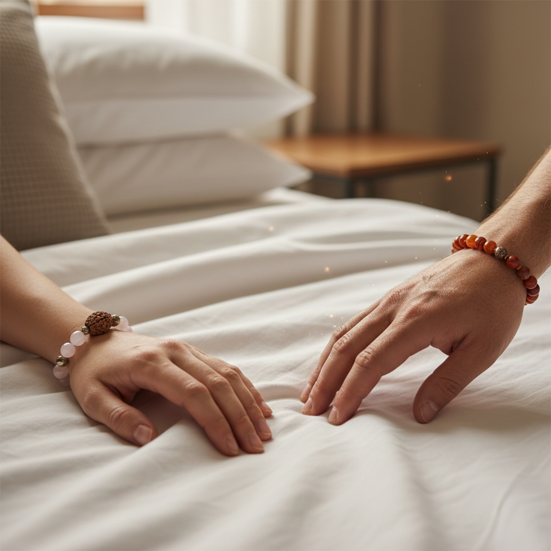The Love & Nurture Kit is a thoughtfully curated fertility and family-blessing set designed for couples wishing to conceive or begin a nurturing family journey. It includes a 7 Mukhi Rudraksha + Pyrite + Rose Quartz bracelet to invite abundance, emotional balance, and nurturing feminine energy, a Carnelian + Red Jasper bracelet to support masculine vitality and positivity, and a Rose Quartz ball to create a calm, loving home environment.