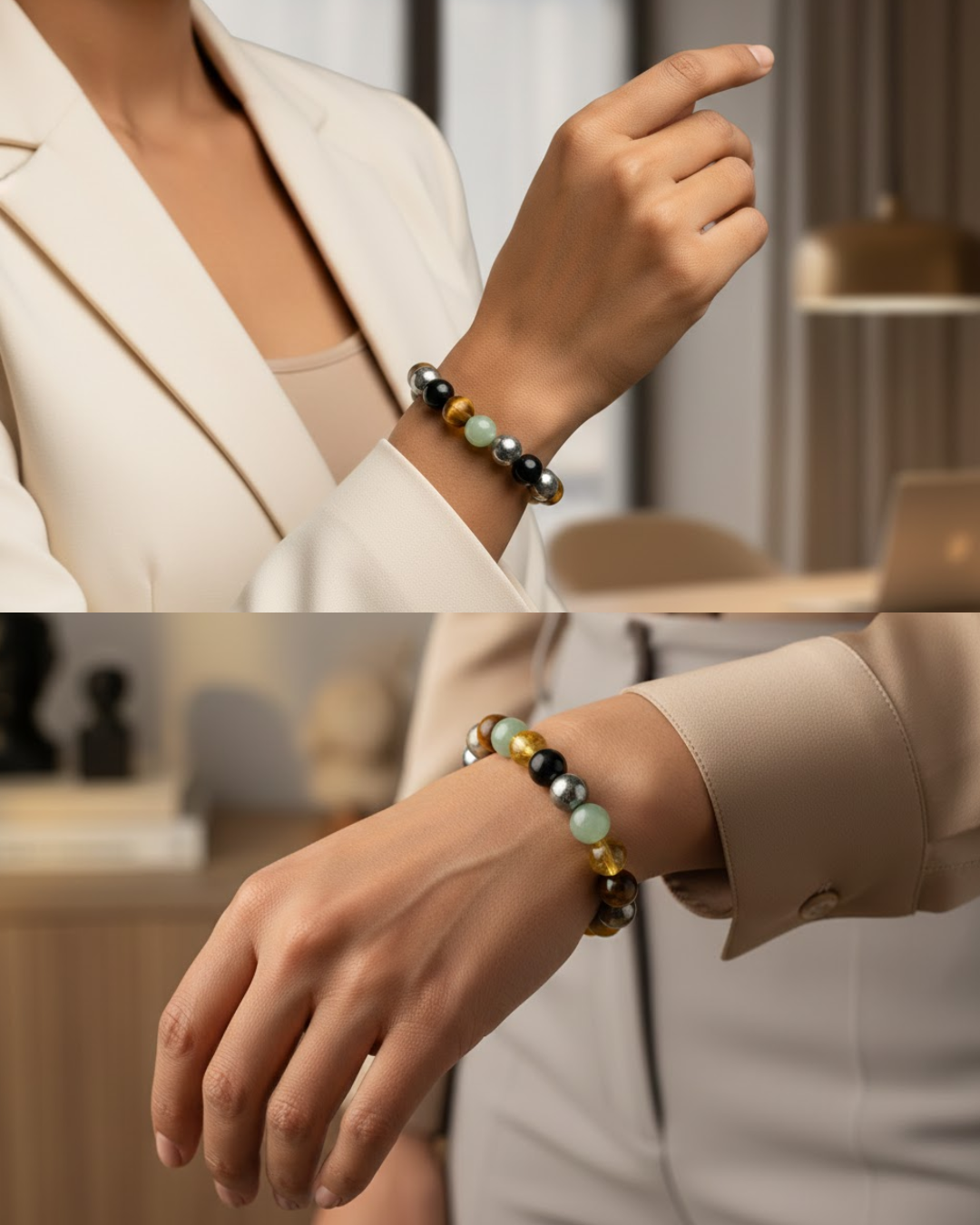 The Money Multiplier Bracelet combines Pyrite, Tiger’s Eye, Black Tourmaline (or Obsidian), Citrine, and Green Aventurine to attract wealth, protect finances, and boost opportunities. Handcrafted, energetically blessed, and delivered in premium packaging—ideal for daily wear or gifting.