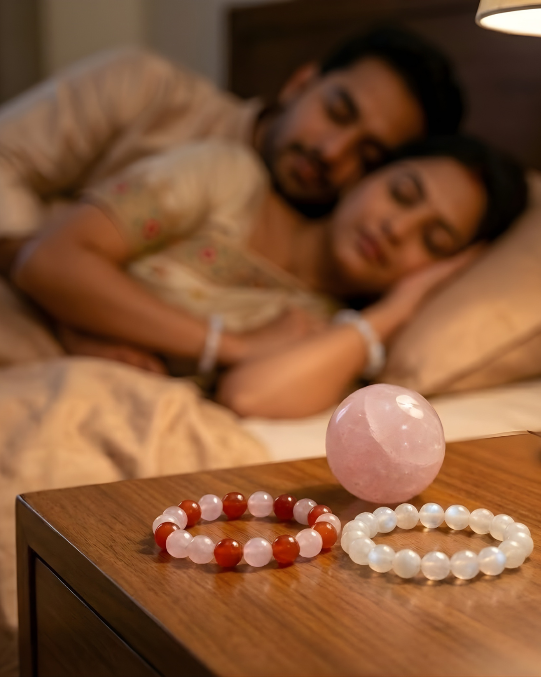 The Romance Renewal Kit is a complete love-energizing set designed to restore passion, intimacy, and emotional closeness in relationships. It includes a Carnelian + Rose Quartz bracelet, a Moonstone bracelet, and a Rose Quartz ball for home placement. Carnelian ignites desire and confidence, Rose Quartz deepens love and tenderness, Moonstone strengthens emotional bonding, and the Rose Quartz ball fills the bedroom with soft, nurturing romantic energy.